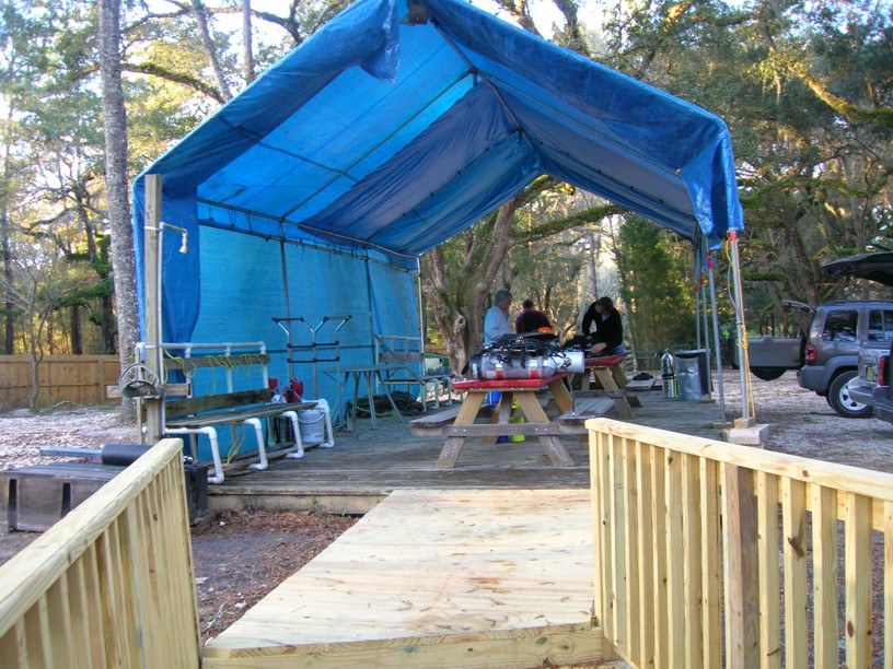 A tarp over our benches for gearing up in the rain.